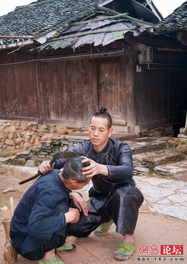 In Liang Qi, Dong village or southeast DongZhai, the barber use a sickle to give haircuts. The scene looks very horrible and scary. But it is an ancient custom of this village.